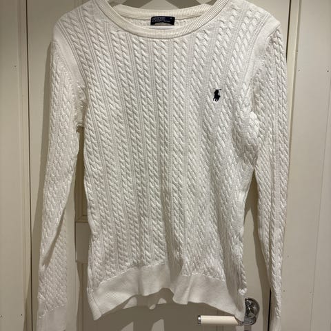 Flott genser med klassisk flettemønster fra Ralph Lauren. Farge er noe mellom metalisk grå og sølv, veldig stillig (ikke 'harry' farge). 56% bomull ig 44% viskose. Meget pent brukt, skadefri.