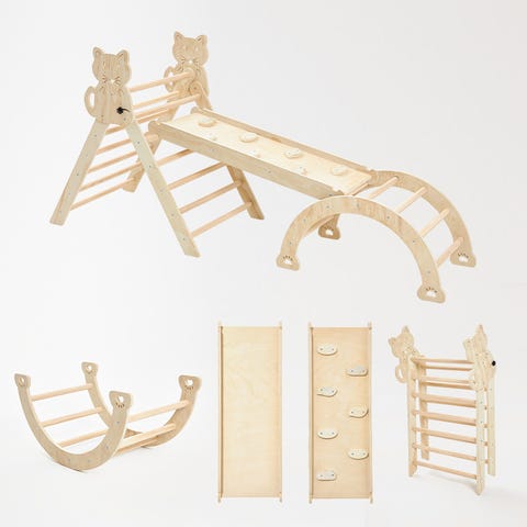 Dette klatresettet i tre, laget i Montessori-metodens ånd, gir ikke bare god underholdning, men utvikler også sosiale og motoriske ferdigheter og styrker barnets koordinasjon. Det er en flott gave til gutter og jenter som vil inspirere barn til å utforske verden og tilbringe tid med venner. Vi sørger for at det er en uforglemmelig opplevelse som vil fremme barnets utvikling og samtidig opprettholde de høyeste sikkerhetsstandardene.