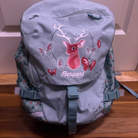 Bergans sekk med regntrekk. Mange justerings muligheter i ryggen. Masse forskjellige lommer til oppbevaring og drikkeflaske. Vært brukt som skolesekk. Trur den er 24 liter.