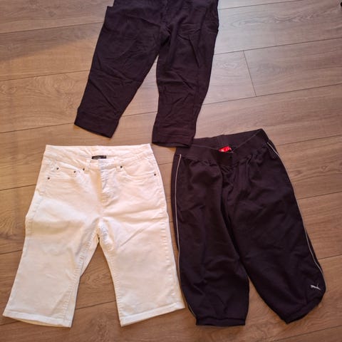 Capribukse fra H2O i 100 % bomull selges rimelig. Lukkes med knapp og glidelås, men har også snøring i livet. Tynn og behagelig, lommer foran. Str. L, damemodell.