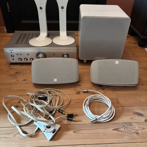 Kjøpt på HiFi klubben Bergen, deira vurdering av bruktpris i dag er ca 6500,- totalt. Vert helst selt samla. Kom med bod. Pris kan diskuterast, men vert ikkje gitt vekk. Stått nedpakka på eit loft dei siste 10 åra. Finn ikkje igjen fjernkontroll.