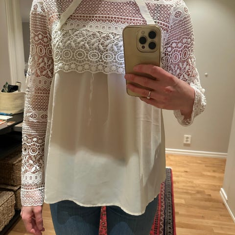 Fin hvit bluse med blondedetaljer, pent brukt. Str. 38.