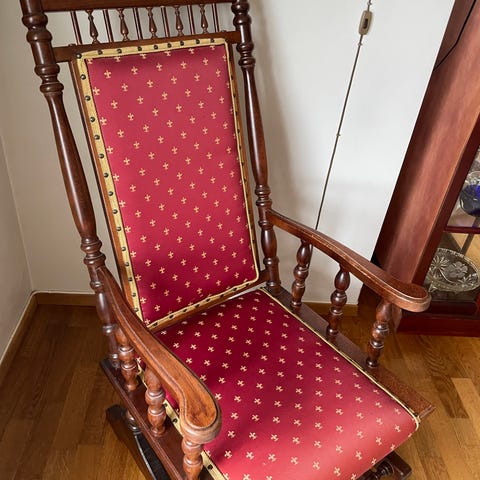 Selger min gamle amerikanske gyngestol. Den er original, har pent trekk og gyngemekanismen fungerer som den skal.