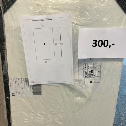 Det er en lang benkeplate med to korte benkeplater i hver ende-som vist på tegningen. Benkeplatene er pakket opp og pakket ned igjen pga feilbestilling.