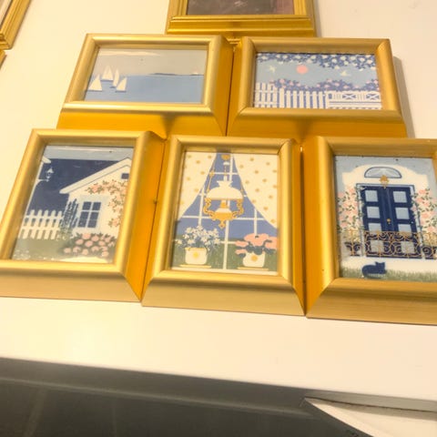 7 stk.små porselen bilder med hyggelige motiv.Må hentes.