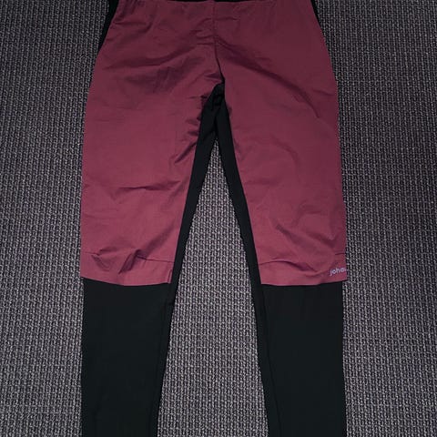 Fin, burgunder farge, men perforerte områder på legg/lår i front.