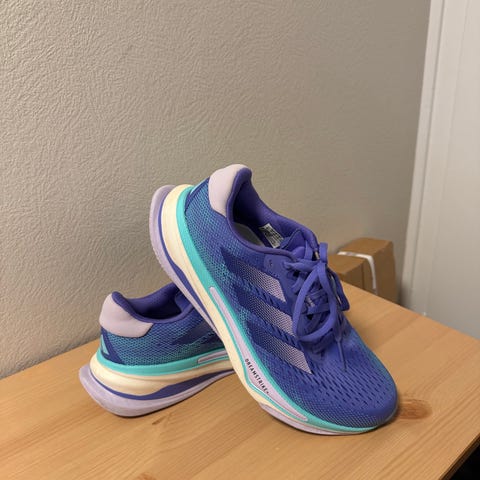 Helt nye Adidas supernova 2 joggesko i str 41 1/3 selges. Som det er vist på bildet står det schenker på den ene skoen. Kan sendes hvis kjøper betaler frakt.