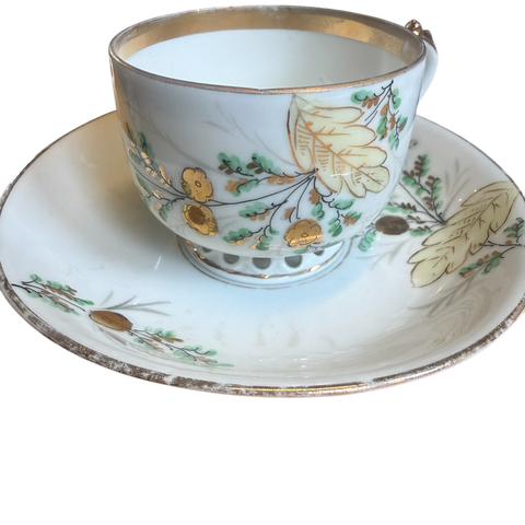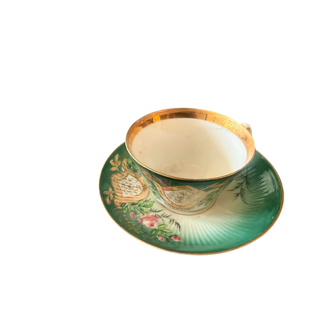 Vintage grønn og gull Limoges Demitasse benporselen miniatyrkopp, tekopp og fat