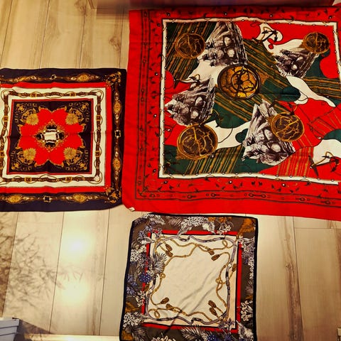 Tre små, smale skjerf i tre rosafarger. Enkle, men fine. Pris for alle tre sammen med porto for sending. Fine å sette opp håret med bla. Kun vanlig post, ingen henting, ingen bud
