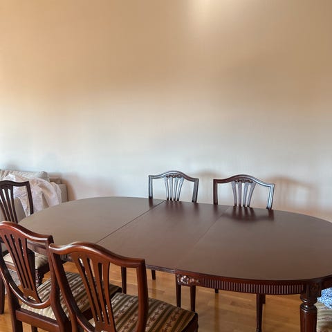 Hei, selger min pent brukte spisegruppe fra Trademax. Kjøpt for ca. 5 år siden og er i god tilstand. Den består av 6 skinnstoler og ett stort bord med god plass som består av 3 svarte glassplater i midten.