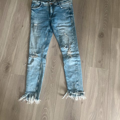 Lite brukte jeans fra Zara, høy i livet, ripped, lange ben med splitt nederst. Lys denim.
