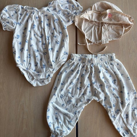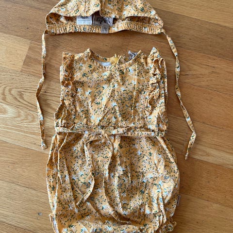 Pent og lite brukt gul MeMini sommerdrakt med små blomster. Str 68. Følger med lue. .