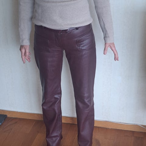 Mørkebrun skinnbukse fra det franske luksusmerket Vent Couvert. Fransk størrelse 40-passer norsk størrelse S. Livvidde er 74 cm, skrittlengde 27 cm og indre benlengde 80 cm. Lukkes med trykknapp og glidelås i front, 2 små lommer foran. Laget i mykt lammeskinn, fór av polyester. Pent og lite brukt uten slitasje eller andre bruksmerker.