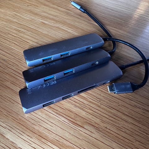 Har masse adaptere til overs fra mine år i USA. Har orginale IPhone adaptere, andre merker til USB C adapter for Mac. Kabel til MacBook fra Apple osv. se bilder eller still spm.