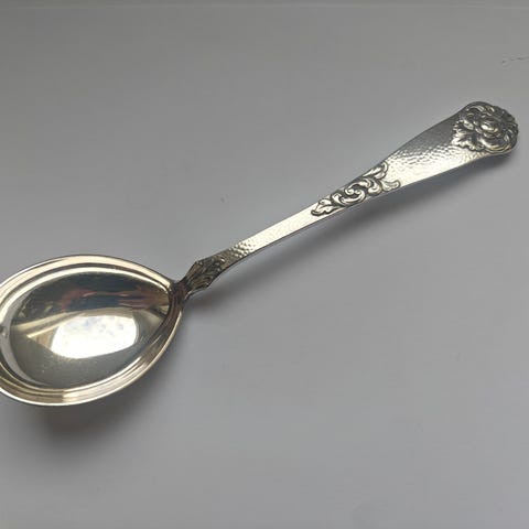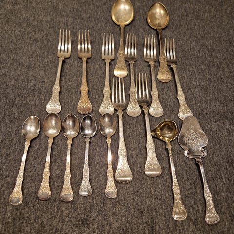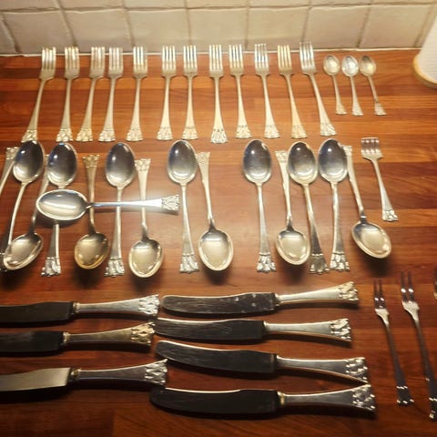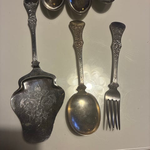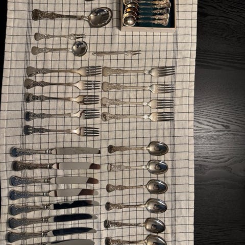 Flat rose bestikk (40 gr) med 32 deler. Noen få bruksspor. Er blant annet 6 stk skjeer (ca 17 cm) og 6 stk gafler (ca 17 cm).