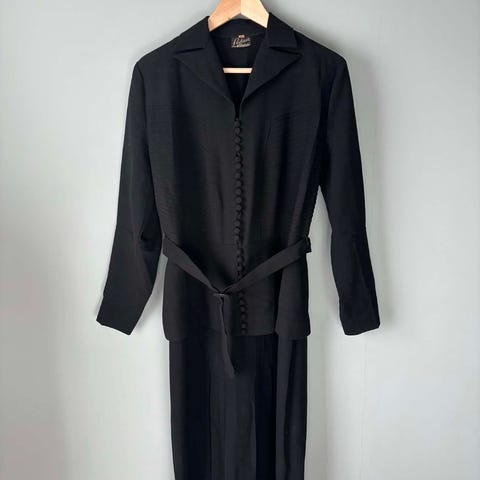 Mac Scott todelt svart antrekk. Skjørtet er legglangt, sitter veldig pent. Overdelen faller som en litt lengre jakke over baken. Jakken har lommer og pene knapper. 38 str.angitt på delene. Drakten er svart, ser litt gråaktig ut på bildet.