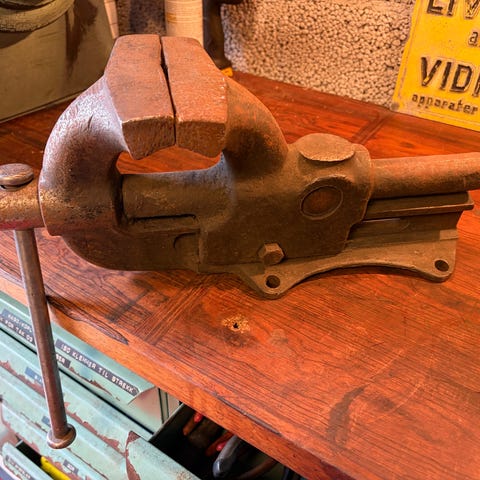 gammel skrustikke, vintage skrustikke, retro verktøy, støpejern, bordskrue, verkstedutstyr, industriell dekor