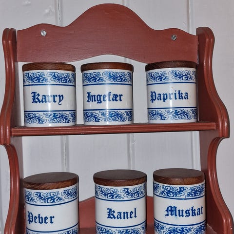 Sjarmerende krydderhylle. Mørk blå og kremhvit keramikki krukker og skuffer.