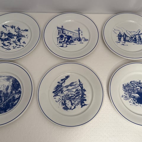 7 veldig pene dekketallerken utgitt av Figgjo for Nodest vei ca 1990 Se bilder for motiv og år. Disse er som nye. Diameter 30 cm. Selges 70,- pr stk. Sender post.😉