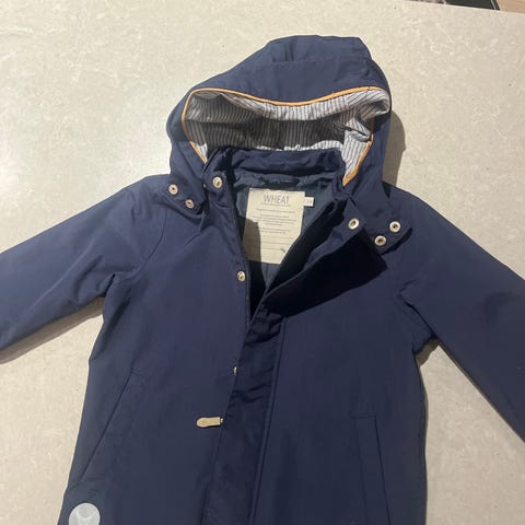 Veldig fin jakke fra Wheat str 4 år. Mørk blå. Kun brukt et par ganger.