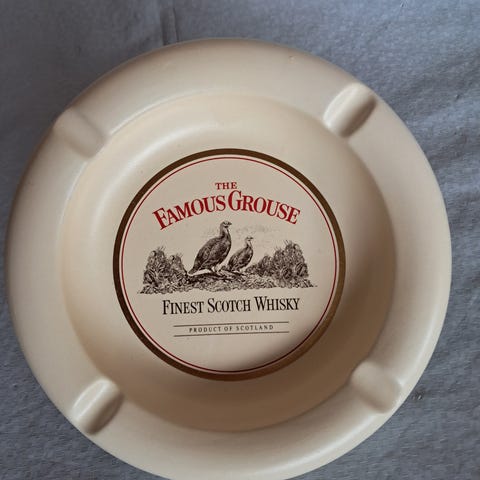 Stort Whiskey reklame askebeger. Askebeger har logo og reklame for Famous Grouse Whiskey.