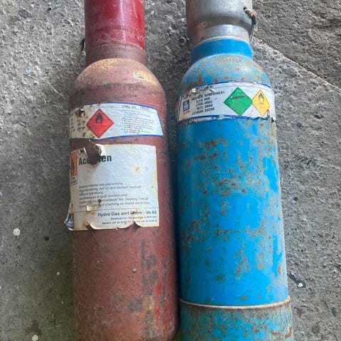 5 liter gassfasker for oksygen og acetylen selges, har også 1 flaske for sveisegass. Dette er eieflasker som man bytter inn hos forhandler når de er tomme. Selges 1600.- pr. stk. Flaskene er tomme… mob 98295670