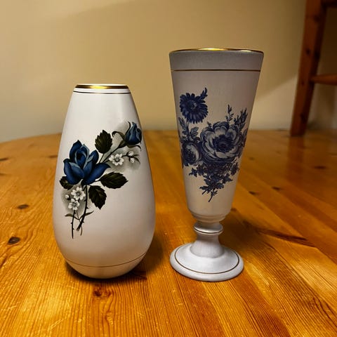Vase og 2 lysestaker i hvit og lilla farge