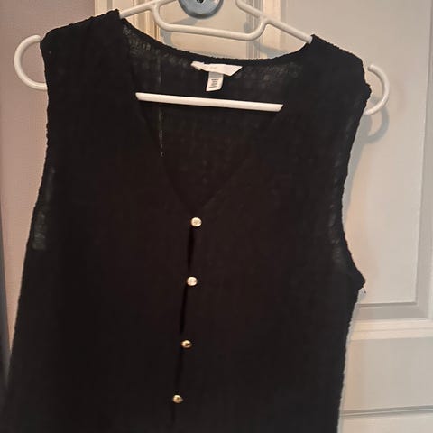 Søt liten topp fra NOA NOA. Det står str L i den, men den er liten i str og tilsvarer mer en str M eller 38-40z. Lukkes med skjulte trykk-knapper. Små paljetter langs kanten.