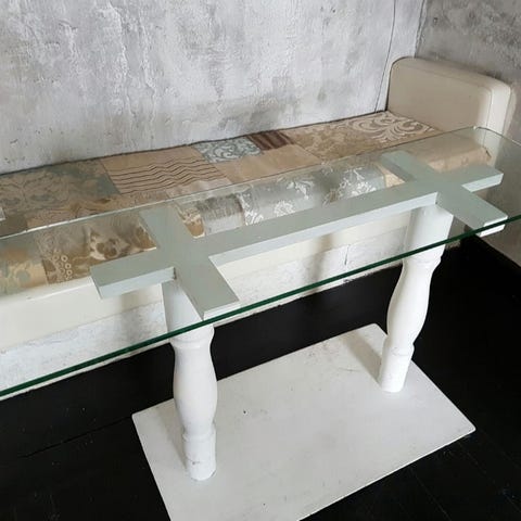 Spesiallaget metallramme, med en påmontert håndskåret sengegavl fra Indonesia i front. Det er også oppheng til 2 bredder innpakningspapir og bånd i disken. Disken er brukt med glassplate, men denne følger ikke med.