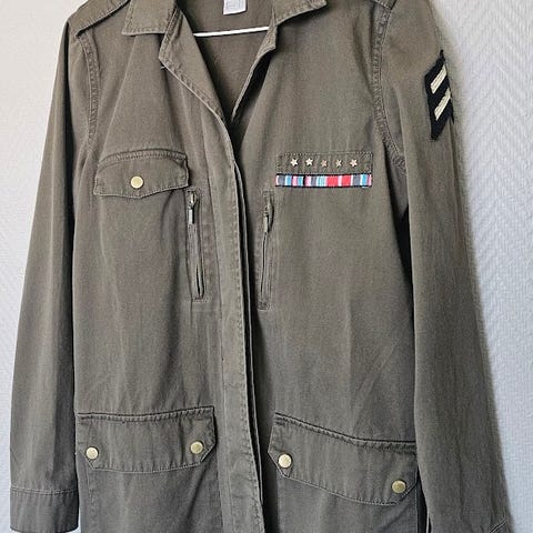 Fin «militær inspirert» jakke fra H&M. Brukt få ganger. 100% lyocell/bomull. Farge: jakken er mer grønn enn på bildet, «skogsgrønn».