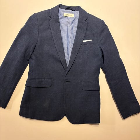 Dressjakken er mørk blå, med lommer, fra HM.