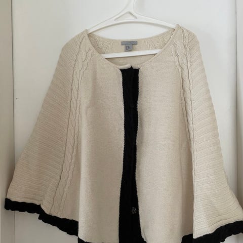 Cape med lommer og hette fra H&M selges. Beige strikk i ullblanding, str M. Pent brukt.