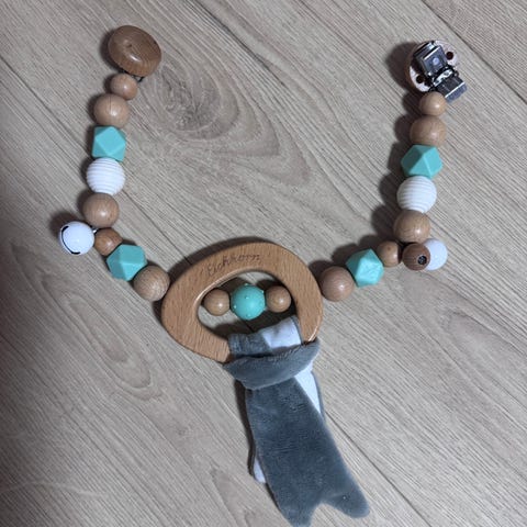 Biteringen er festet med flotte perler med forskjellige teksturer som barna kan ta og føle på for sensorisk stimulering. I tillegg er det et praktisk håndtak som gjør det enkelt for små hender å holde fast i biteringen.