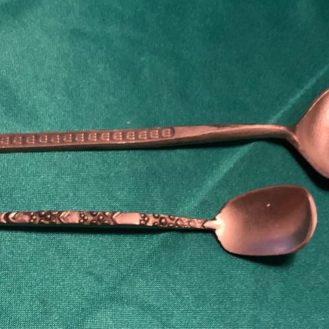 Serveringsett salat. Disse er i tinn og er 27 cm lange. De er fra Hadeland tinnstøperi. Må hentes.