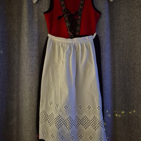 Pen festdrakt. Kort modell. Stakken er fra Peko Stranda og er str 6 år. Skjorten er Rosenberg 7 år. Tinnknapper. Pent brukt.