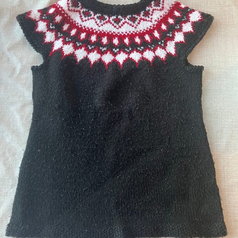 Kjole laget i alpakka ull passer til en kraftig 2 åring. Lende 51 cm rund i livet 58 cm har to lommer foran. Bluse og forkle er ikke inkludert.