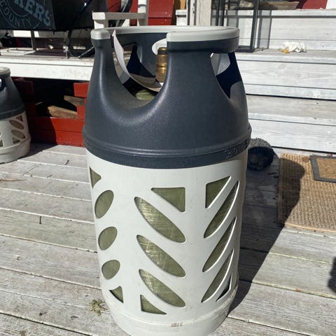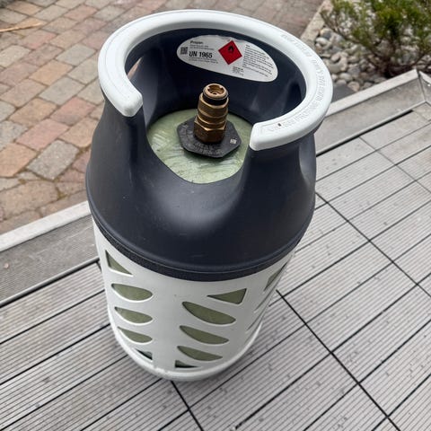 Gassflaske 10 kg. Nypris 1100-1200. Penger å spare når man uansett får en brukt tilbake når man kjøper refill.