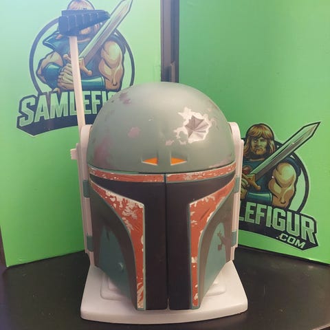 Selger her en ekstremt høy kvalitets hjelm laget av Master Replicas i 2008. Dette er en hjelm laget av glassfiber og er malt for å være helt lik den i filmene. Hjelmen har en «distanse måler» man kan vippe ned og da begynner den å blinke. Hjelmen er fullt foret på innsiden. Dette er en signature edition som vil si at det følger med en plate med signaturen til Jeremy Bulloch som spilte Boba Fett i original trilogien. Dette er nr. 483 av 750 på verdensbasis. Hjelmen kommer også med en holder man kan sette hjelmen på for utstilling. Denne kommer uten den originale boksen men ellers er alt med av hjelm, stativ og signert plate. Pris kan diskuteres og den kan sendes på kjøpers regning og risiko. Ta kontakt om du har noen spørsmål.