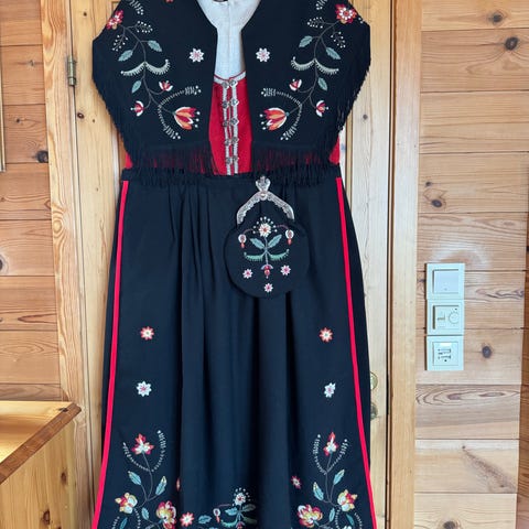 Selger komplett Rogalandsbunad. Sort stakk med rød vest. Selges med sølv om ønskelig for en ekstra kostnad. Bunad, forkle, sjal, belte, veske og lue. Passer til ca 160-165 cm.