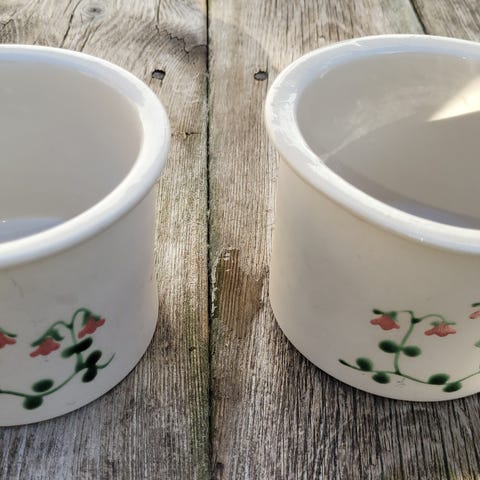 Tre keramikk-/terrakottakrukker selges samlet. Den ene er veldig stor og praktisk (32 cm i diameter og ca 29 cm høy) med matchende skål, og to er små og nette (12 cm i diameter og ca 11 cm høye).