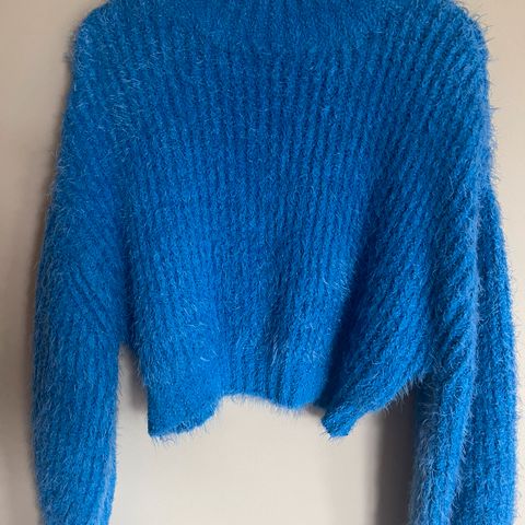 Nydelig blå genser myk og god. Elastisk fluffy og faller pent. Brukt Max en gang.Har blitt liggende i skapet og vokst i fra.Se bilder for mer beskrivelse