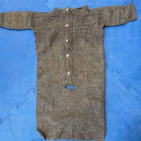 Hjemmestrikket pose til å bruke i bilstol. Egen åpning til selen som vises på bildet.