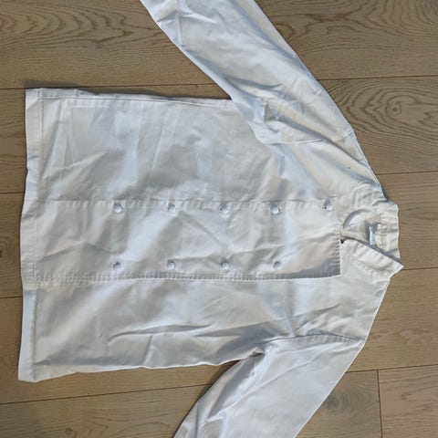 En slitesterk langermet kokkejakke med knappefeste på høyre side.