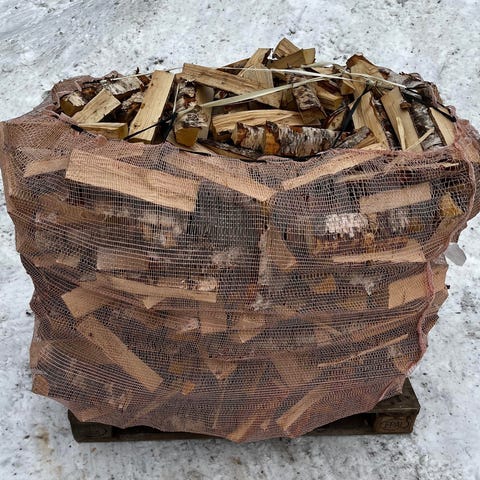 Bjørkeved i 30 cm lengder og 1000 l sekk
