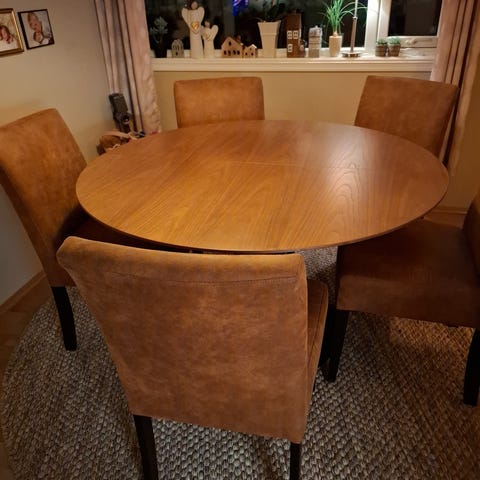 Kjøpte stolene brugt. Det er lakkerte. Men har ikke bruk for alle. Selger set 4 stk. Har 8 stoler tilbake. Pris pr stol