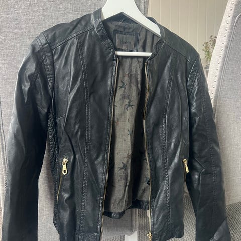 Sort imitert skinnjakke fra B Young (BYACOM jacket) str 38 selges for 100,- Nyrpis 799,- Pent brukt, fremstår som ny. Kjempefin jakke til vår, sommer og høst 😊