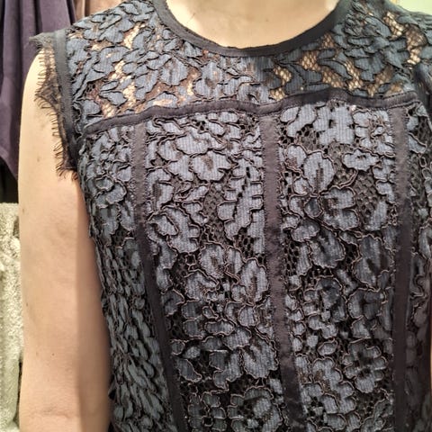 Mørkeblå pen og klassisk blondekjole i knelengde og med lange ermer. Underkjole på hoveddelen av kjolen, gjennomsiktig på ermene. Pent brukt, opprinnelig fra Days Like This.