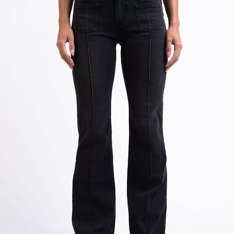 Grå, smal øverst, og vide ben nederst, stretch.