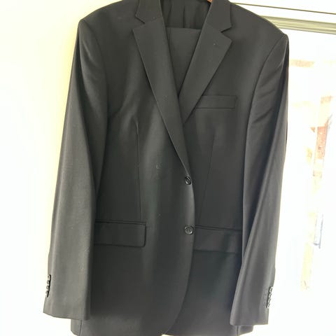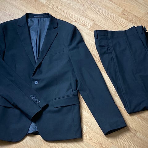 Svart blazer og bukse fra dressmann. Jakken er regular slim fit str 50, Bukse er str 31-34. Pent brukt