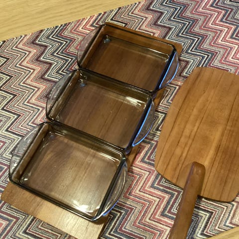 Retro teak set med salt pepper 2 glass skåler og brett 60 tallet